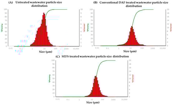 The particle size distribution of untreated, DAF-, and SEFS-treated wastewater is shown in Figure 5.