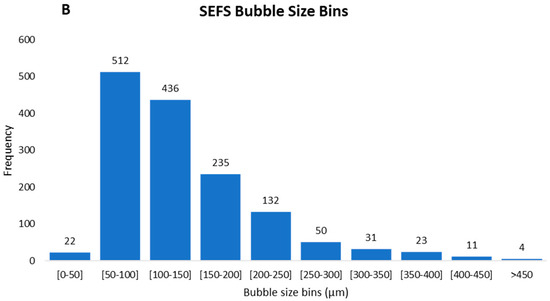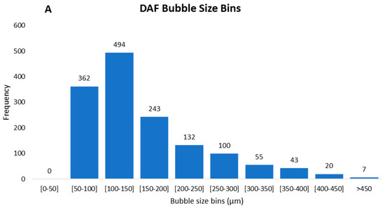 A total of 1456 bubbles were quantified, and the different bubble size bins are illustrated in Figure 8. The mean conventional DAF bubble size (Figure 8A) fell within the bin range of 50–150 µm, representing roughly 60% of the bubble’s sizes. According to various literature studies, these bubble sizes are well within the reported range for DAF treatment of wastewater [66,67,68]. When the wastewater was exposed to hydrodynamic shear (Figure 8B), the frequency of smaller microbubbles was observed to increase. The bubble size in the range 50–100 µm was 30% more with shear treatment than conventional DAF treatment. Furthermore, unlike the DAF-treated wastewater, the SEFS treatment generated bubbles with sizes less than 50 µm. The enhancement in the frequency and quantity smaller bubbles (<100 µm) may therefore explain the higher removal efficiencies when using hydrodynamic shear as a component during winery wastewater treatment. Wu et al. (2015) similarly stated that smaller gas bubbles and their ability to increase the contact area (spreading of the gas bubble on the particle) creates an environment where the hydrodynamic disruptive shear force remains stable [69]. In other words, microbubbles induced by hydrodynamic shear selectively attach to micron-size particles while still keeping their mechanical strength and integrity.