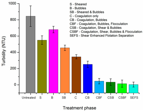 Relating the bubble size presented in Figure 7 to the particle size in Figure 5, it can be inferred that the separation process was more effective when the bubble size and the particle size are in the same order of magnitude. For example, the average bubble size of the conventional DAF treatment was 126 μm. In comparison, that of the SEFS-treated wastewater was 62 μm. The shear unit creates a highly turbulent environment and increases the collision probability between colloids and bubbles, which enhances the solid/liquid separation process as opposed to that without shearing in conventional DAF treatment. By increasing the collision frequency between bubbles and particles and capture efficiencies, greater separation efficiencies can be achieved [65].