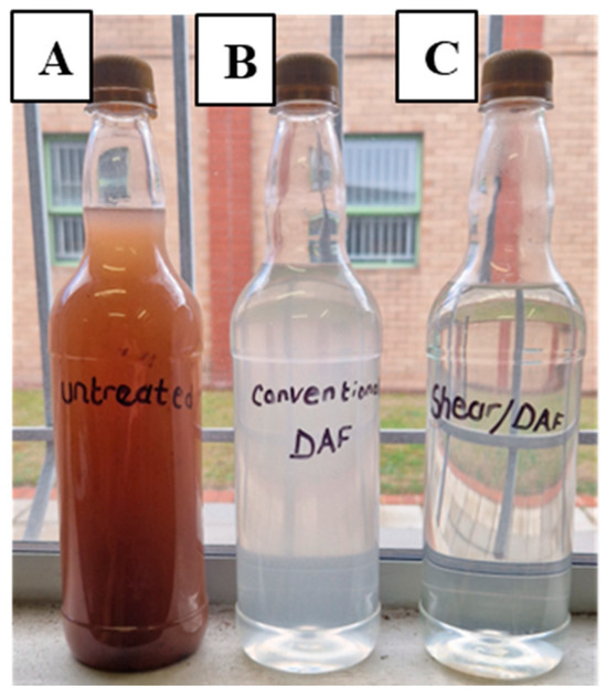 The increase in particle size may be attributed to the effect of coagulation and flocculation processes, which induces the process of particle destabilization by charge neutralization followed by bringing together the destabilized particles form a larger agglomerate that is removed during flotation [25]. The SEFS-treated wastewater, on the other hand, displayed average D50 particle size values of 23.65 µm. This significant growth in particle size is attributed to the hydrodynamic shear mixing, which induces agglomeration and subsequently causes colloidal destabilization of the particles in solution [56]. It is reported in the literature that particles agglomerate faster when exposed to shear due to an increase in particle collisions [57]. With reference to the PSD, it is evident that both DAF as well as SEFS results in the aggregation of colloidal particles, demonstrating the formation of larger particles, subsequently enhancing the separation process.