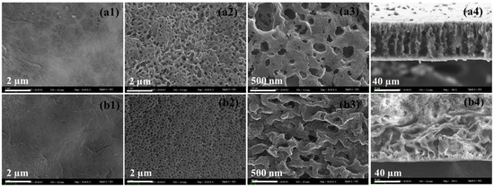 Morphologies of the top layer surfaces (a1,b1), sub-layer surfaces (a2,b2), magnified sub-layer surfaces (a3,b3), and cross-sections (a4,b4) of PVDF-based membranes. Scanning electron microscopy (SEM) images of (a) PEI-modified PVDF and (b) mixed-matrix PVDF membrane.