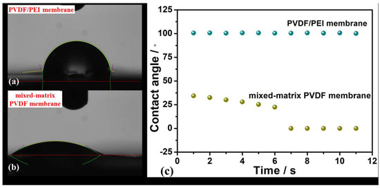 Generally, a smaller static water contact angle indicates higher surface hydrophilicity, a faster dynamic contact angle change, and greater material wettability [37]. In the first 1 s, the mixed-matrix PVDF membrane featured a static water contact angle of 34.4° (Figure 3b), which is significantly smaller than that of the PVDF/PEI membrane at 100.6° (Figure 3a). Figure 3c shows the dynamic contact angle curves of the samples. Notably, after 11 s of drop aging, the contact angle of the PVDF/PEI membrane did not decrease, indicating its water stability. In contrast, the water contact angle of the mixed-matrix PVDF membrane decreased to 0° after 7 s. This significant change was attributable to the introduction of hydrophilic PVP into the membrane matrix. A comparison of the pollution resistance between the PVDF/PEI membrane and the mixed-matrix PVDF membrane is shown in Table S1, with their m values being 0.96 and 0.11, respectively. A smaller m value indicates a stronger anti-fouling property, suggesting that the mixed-matrix PVDF membrane exhibited significantly higher excellent anti-fouling ability. Pure water fluxes of the PVDF/PEI membrane and the mixed-matrix membrane after different numbers of immersion and drying processes are shown in Figure S1. The hydrophilic stability of the mixed-matrix PVDF membrane was better than that of the PVDF/PEI membrane. At the beginning of the experiment, some uncrosslinked PVP still existed in the membrane, and the water flux was large. With the increase in the water permeation times, the uncrosslinked PVP dissolved gradually from the membrane into the water, and the crosslinked PVP remained in the membrane, maintaining the hydrophilicity of the membrane and leading to the stable water flux of the mixed-matrix PVDF membrane.