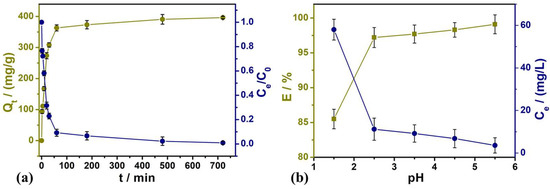 Dependence of the adsorption capacity on contact time (a); effect of solution pH on Hg(II) ion adsorption by the mixed-matrix membrane (b). (Except for the investigated parameters, others were fixed at C0 = 400.0 mg/L, sample dosage = 20 mg/20 mL, temperature = 30 °C, pH = 5.5, and adsorption time = 720 min).