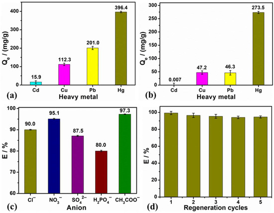 Adsorption result of the single metal ion solution (a); adsorption result of the mixed-metal ion solution (b); interference effect of anions (c) (concentration of anion: 50 mmol/L), reusability test on the adsorption capacity of the mixed-matrix membrane for Hg(II)ions (d). (Except for the investigated parameters, others were fixed at C0 = 400.0 mg/L, sample dosage = 20 mg/20 mL, temperature = 30 °C, pH = 5.5, and adsorption time = 720 min.)