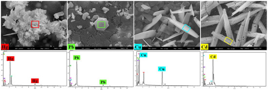 In a single metal ion solution (Figure 6a), the mixed-matrix membrane exhibited a loading capacity of 396.4 mg/g for Hg(II) ions, which is significantly higher than that of other metal ions. The decreasing order of adsorption capacity among various metal ions was Hg(II) > Pb(II) > Cu(II) > Cd(II). Among the four common heavy metal ion mixed solutions, the composite membrane exhibited adsorption capacities of 273.5, 46.3, 47.3, and 0.007 mg/g for Hg(II), Pb(II), Cu(II), and Cd(II) ions, respectively (Figure 6b). This indicates that the membrane effectively removed Hg(II) ions and featured a certain removal capacity for Pb(II) and Cu(II) ions. However, the membrane could not adsorb Cd(II) ions, and the selectivity of the membrane for Hg(II) ions was 1.2 × 105 times that for Cd(II) ions (Table 1). This property made the membrane suitable for the efficient and selective removal of Hg(II) ions from wastewater containing Cd(II). Additionally, common anions (Cl−, NO3−, SO42−, H2PO4−, and CH3COO−) were selected as co-existing anions to investigate their effect on the adsorption capacity of the adsorbent, with Na+ as the cation. The result is shown in Figure 6c. NO3− and CH3COO− featured no significant effect on the adsorption rate of the membrane. However, Cl−, SO42−, and H2PO4− led to a significant decrease in the adsorption rate, with a maximum decrease of 20%. The mixed-matrix PVDF composite membrane loaded with the Hg(II) ions can be desorbed using a 2 mol/L HCl solution and then regenerated using a dilute NaOH solution successively. After five sorption–desorption cycles, the adsorption rate of the membrane remained above 90% (Figure 6d). The SEM mapping images of the mixed-matrix membrane after the adsorption of single and mixed-metal ions are shown in Figure 7 and Figure 8, respectively.
