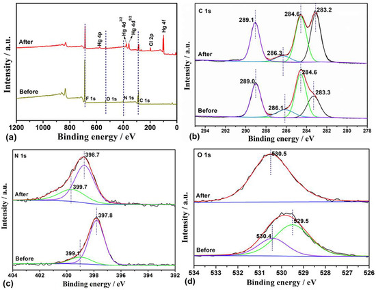 (a) XPS spectra of the survey; (b) C 1s; (c) N 1s; (d) O 1s of the mixed-matrix membrane before and after Hg(II) ion adsorption.