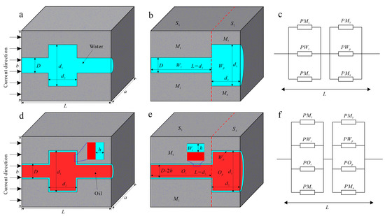 (a,d) Geologic models of vuggy reservoirs saturated with water (a) and oil (d). (b,e) Corresponding conductivity models. (c,f) The equivalent resistance models of vuggy reservoirs. The model parameters are marked and described as follows: a, b, and L are the width, height, and length of the modeled rock, respectively, in μm; D is the diameter of the throat, in μm; d1 is the width and height of the pore (perpendicular to the direction of the current), in μm; d2 is the length of the pore (along the direction of the current), in μm; and h is the water film thickness, in μm. The symbols are described as follows: Wt is the throat water; Wp is the pore water; Ot is the throat oil; Op is the pore oil; M1 is the rock matrix block 1 located in the upper part of the throat; M2 is the rock matrix block 2 located in the lower part of the throat; M3 is the rock matrix block 3 located in the upper part of the pore; M4 is the rock matrix block 4 located in the lower part of the pore; S1 is the throat and surrounding rock matrix module; S2 is the pore and surrounding rock matrix module; PM1, PM2, PM3, and PM4 are the equivalent resistance of rock matrix blocks 1, 2, 3, and 4, respectively; PWt, and POt are the equivalent resistance of throat water and oil, respectively; and PWp and POp are the equivalent resistance of pore water and oil, respectively.
