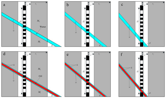 Building upon previous models of singular inclined fractures and inclined slab-like fractures [16,17], we developed three types of fractured formation models according to the geometric relationship between the fracture orientation, borehole radius, and detection depth of the deep lateral resistivity log of the dual laterolog tool: (i) The intersection of the fracture plane with the bottom plane of the electrode column is outside the radial detection depth of the electrode (Figure 2a). The angle between the fracture plane and the bottom plane of the electrode column is the fracture inclination angle θ, in degrees; the vertical distance between the two walls of the fracture represents the fracture width w, in μm; the borehole radius is denoted as r, in m; the radial detection depth of the deep laterolog is r1, in m; and the height of the cylindrical main current of the deep laterolog is H, in m, which is typically 0.74 m. In all models, the effective conductive medium is analogous to that of a vuggy reservoir. (ii) The intersection is between the borehole radius and the radial detection depth (Figure 2b); and (iii) the intersection is within the borehole radius (Figure 2c). Despite the different geometric relationships described above, these models have the following features in common: First, the tool is centered and aligned with the borehole axis, and there is no drilling mud within the borehole; the borehole is externally surrounded by a uniform, infinitely thick formation (rock matrix). Second, the fracture divides the formation into upper and lower sections and intersects with the borehole. Even when the fracture is fully filled with oil, a water film with thickness h (in μm) remains on the surface of the fracture wall (Figure 2d–f).