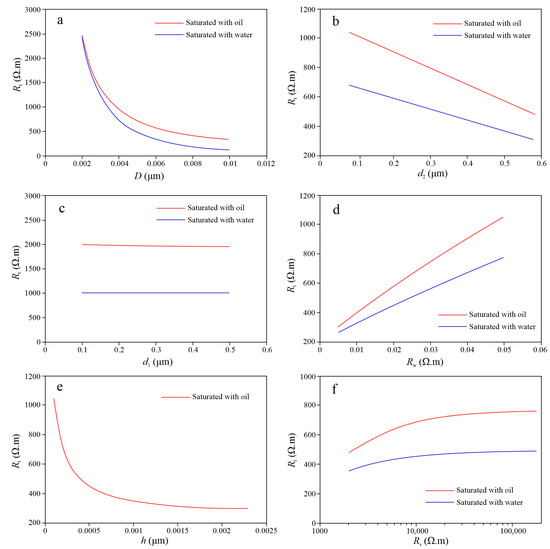 In addition to the sizes and shapes of pores and throats, the formation water resistivity is another factor affecting the resistivity of rocks when their pores and throats are saturated with water or oil (Figure 4d). For this scenario, the parameters were set as follows: d1 = 0.46 μm, d2 = 0.36 μm, h = 0.001 μm, D = 0.005 μm, and Rs = 20,000 Ω.m. As the resistivity of the formation water increased, both the water-saturated and oil-saturated rock resistivities displayed notable linear increases. Moreover, the increase in resistivity was more pronounced for rocks with oil-saturated pores and throats, suggesting that the formation water resistivity has a stronger effect on the resistivity of oil-saturated rocks than on that of water-saturated rocks.
