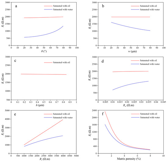 Figure 5d presents the effect of formation water resistivity on the resistivity of fractured reservoirs. The parameters are set as follows: w = 40 μm, θ = 80°, h = 0.32 μm, and Rs = 2000 Ω.m. As the resistivity of formation water increased, the resistivity of oil-saturated rocks increased slightly, while the increase in resistivity of rocks with water-saturated fractures was more pronounced. When Rw < 0.02 Ω.m, the resistivity of rocks with water-saturated fractures markedly increased with increasing formation water resistivity. However, when Rw > 0.02 Ω.m, the effect of formation water resistivity on the resistivity of rocks with water-saturated fractures became significantly weaker. The simulation results indicate that the effects of formation water resistivity on the resistivity of rocks with water-saturated and oil-saturated fractures are generally minor, especially for rocks with oil-saturated fractures.