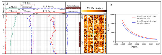 Figure 7a displays a section of the logging curves of well X of the Ying 2 member in the Tazhong area. This section represents a vuggy reservoir. In the depth range of 4695–4710 m, the computed porosity averaged 2.3%, and the deep laterolog resistivity (RLLD) was 4725 Ω.m, suggesting that this section is an oil-bearing layer. However, production tests for this section had a daily output of 0.23 m3 of crude oil and 32.88 m3 of water, classifying it as a typical high-resistivity water-bearing layer—contradictory with respect to the logging interpretation result. The logging curve response characteristics, along with the macro-porosity and saturation parameters, fail to clarify this anomalous phenomenon. To gain insights into this anomaly from the perspective of the microscopic pore structure, we assumed both d1 and d2 to be 0.25 μm (i.e., matrix porosity Ø = 0.56%), with Rw = 0.015 Ω.m and Rs = 20,000 Ω.m. Figure 7b illustrates the theoretical simulation of the rock resistivity of the water-bearing layer in relation to the throat diameter. As the throat diameter decreased, the resistivity increased. This may be explained as follows: When the pores are not interconnected, there is no conductive pathway, resulting in a relatively high resistivity that possibly approaches the matrix resistivity of the rock. This suggests that, in such a scenario, the rock resistivity is not influenced by the fluid properties within the pores. As the porosity increased from 1.56% to 3.6% and d1 and d2 correspondingly increased from 0.25 to 0.33 μm, the simulated rock resistivity did not decrease significantly (Figure 7b). This further confirms that in the absence of pore connectivity, variations in pore size do not notably influence rock resistivity, and the effect of throat diameter is more pronounced. Formation microresistivity images of this section display numerous small pores, suggesting that the narrowness of the pore throats might be the primary factor contributing to the significantly elevated resistivity of this layer.