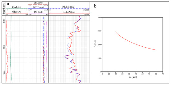 Figure 8a displays a section of the logging curves of well Y in the Tazhong area of the Tarim Basin, western China. This section represents a fractured reservoir with limited porosity. In the depth range of 5784–5795 m, the computed porosity was less than 2%, and the deep laterolog resistivity (RLLD) was ~200 Ω.m, characterizing it as a typical low-resistivity dense layer. Using the actual parameters of this well and the theoretical Equation (18), we simulated the effect of fracture width on the resistivity of water-saturated rocks (Figure 8b). The simulation parameters were set as follows: θ = 60°, h = 0.32 μm, Rw = 0.04 Ω.m, Rs = 2000 Ω.m, Sw = 50%, and Ø = 1%. The resistivity of dense rocks with small matrix pores decreased significantly as fracture width increased. For carbonate reservoirs with limited porosity, the reservoir resistivity should not differ greatly from the rock matrix resistivity. However, when fractures are formed and saturated with water within the reservoirs, an increase in fracture width would enhance the rock conductivity and thus lead to a substantial reduction in resistivity (Figure 8b); this is a key reason for the low resistivity of dense reservoir rocks. Such characteristics are predominantly found in fractured reservoirs and are relatively less common in vuggy reservoirs and fractured–porous reservoirs.