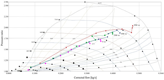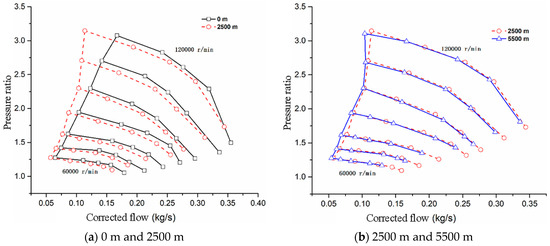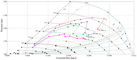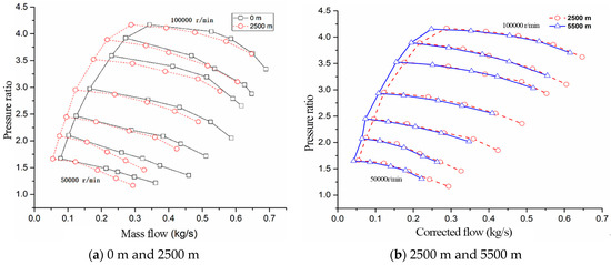 It can be seen from Figure 11 and Figure 12 that when the altitude increases, that is, when the ambient pressure and temperature of the intake air decrease, the mass flow rate at the same measurement condition point decreases. The compressor’s stable working flow range shrinks and moves towards the small flow range, which is conducive to the movement of the joint running line of the diesel engine and compressor towards the small flow range under the condition of altitude change; thus, it can maintain a sufficient surge margin and ensure that the diesel engine’s low-speed torque can work stably. The surge point pressure ratio changed little before and after altitude change, but the plugging point pressure ratio changed greatly with altitude. Compared with the altitude of 0 m, the plugging point pressure ratio of the high-pressure compressor increased by 16.21% and 22.67% at 2500 m and 5500 m, respectively, while the plugging point pressure ratio of the low-pressure compressor increased by 14.96% and 24.66% at 2500 m and 5500 m, respectively.