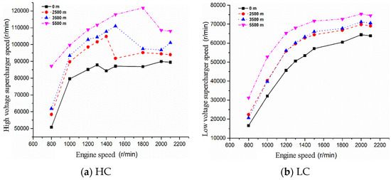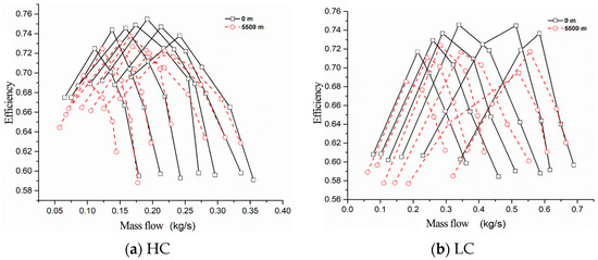 It can be seen from Figure 13 that when the altitude increases, that is, when the intake ambient pressure and temperature decrease, the corresponding efficiency of the HC and LC with the same mass flow rate decreases. However, under the same rotational speed, the maximum efficiency point moves in the direction of the small flow range. The main difficulties restricting the work of the diesel engine with the change in altitude are the surge point and the highest efficiency point; so, under the condition of maintaining the same pressure ratio and intake temperature, if the altitude increases and the efficiency decreases then the exhaust temperature increases and the efficiency of the diesel engine working at high altitude and low speed is low. At the same time, the exhaust energy corresponding to the maximum torque point of the diesel engine at the highest efficiency point of the compressor is insufficient under the high-altitude conditions, and the efficiency of the compressor end reduces the intake volume, which further worsens the performance of the diesel engine.