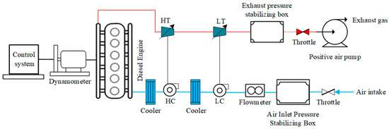 The experiment was carried out on the self-built, centrifugal compressor variable-altitude characteristics test bench, the layout of which is shown in Figure 4. In this paper, a six-cylinder V-type heavy-duty diesel engine is used to study the two-stage turbocharging system composed of KD76GCT and KD100GCT, which are newly matched and selected. The engine specifications are shown in Table 1.