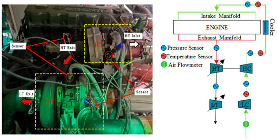 In order to study the effect of altitude on the performance of the two-stage compressor, a pressure sensor and a thermal resistance temperature sensor are installed upstream of the intake manifold high-pressure-stage compressor (HC) and low-pressure-stage compressor (LC). The experimental settings are shown in Figure 5. The Kistler pressure sensor is installed downstream of the HC intake manifold, enabling real-time intake pressure data to be collected for model validation. The electromagnetic speed sensor is mounted on the volute of the compressor for easy recording of the turbocharger speed. A ZWRY-type bent-tube air flowmeter is installed downstream of the LC and records intake volume flow. All data acquisition and post-processing were performed using GT-SUITE v2020.2 software developed by Gamma Technologies. The test equipment information is shown in Table 3.