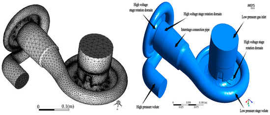 The numerical simulation of the internal flow of a centrifugal compressor adopts computational fluid dynamics (CFD) to simulate the internal flow law of a centrifugal compressor with variable altitude [22]. The flow in a centrifugal compressor is mainly turbulent flow. Considering the complexity and calculation cost of the calculated object, the Reynolds mean numerical simulation was used to solve the N-S equation to obtain the numerical solution of the flow field [23]. For the solution, the dynamic viscosity coefficient μ and thermal conductivity κ are divided into laminar flow and turbulent flow, namely: