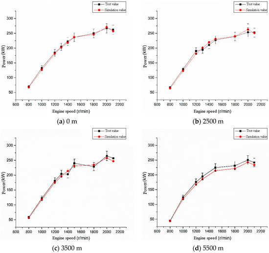 Comparison of point power simulation and test results of diesel engine under full-load conditions at different altitudes.
