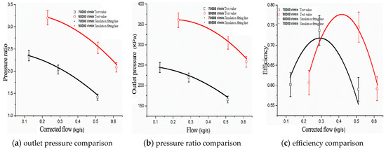 The flow field simulation and verification of the established centrifugal compressor full-passage internal flow model were carried out. The simulation results of the near-surge point, high-efficiency point, and plugging point at the HC 100,000 r/min and 120,000 r/min rotational speeds at a standard altitude were checked with the test data. The curve of the HC outlet pressure, pressure ratio, and efficiency changing with the flow rate is shown in Figure 9. The corresponding results of the LC at 70,000 r/min and 90,000 r/min are shown in Figure 10. It can be seen from the comparison curve in the figure that the calculation results of the outlet pressure and pressure ratio of the HC and LC have high accuracy and that the results are kept within 5% of the allowable error. However, since the calculation model was set as an adiabatic model in the simulation calculation, there were errors between the efficiency calculation results and the experimental data, but the variation trend was still consistent, and the model could meet the requirements for the subsequent analysis of the internal flow field of the two-stage centrifugal compressor.