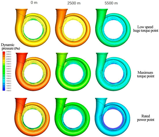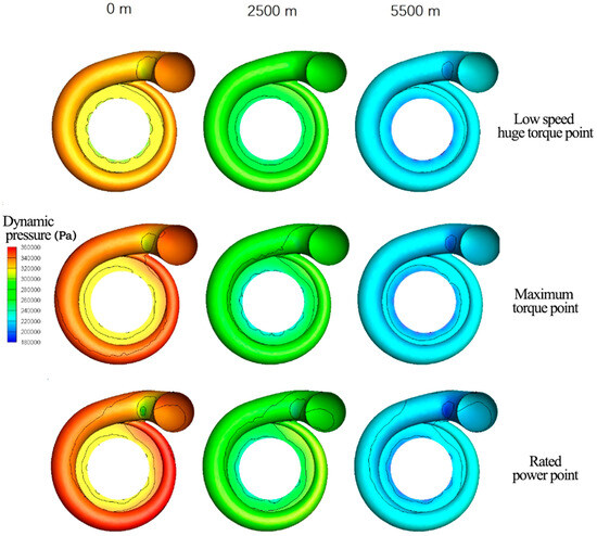 Figure 14 and Figure 15 show the comparison of the static pressure of the volute of the LC and HC under different typical working conditions of the full load of the diesel engine at different altitudes. It can be seen that the static pressure from the inlet to the outlet of the vaneless diffuser increases in general. Among them, after the gas passes through the diffuser, the kinetic energy is converted into pressure energy; so, the static pressure at the diffuser increases rapidly. According to the density of the contour line, the static pressure increase in the rated power point is the largest, followed by the maximum torque point; the low-speed, high torque point is the smallest. Because the structure at the exit of the volute is gradually expanding, the static pressure drops slightly. The LC volute outlet can achieve the maximum static pressure at the maximum torque point, and the HC volute outlet can achieve the maximum static pressure at the rated power point. The maximum static pressure achieved by the volute static pressure of the HC is higher than that of the LC. The static pressure of the volute decreases with the increase in altitude. The LC maximum torque point and the rated power point of the volute static pressure drop is larger at the low-speed, high torque point; the drop degree of the HC’s typical working condition point is similar.