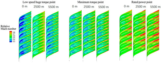 Relative Mach number comparison of 90% blade height section of LC at typical operating points of full-load diesel engine at different altitudes.