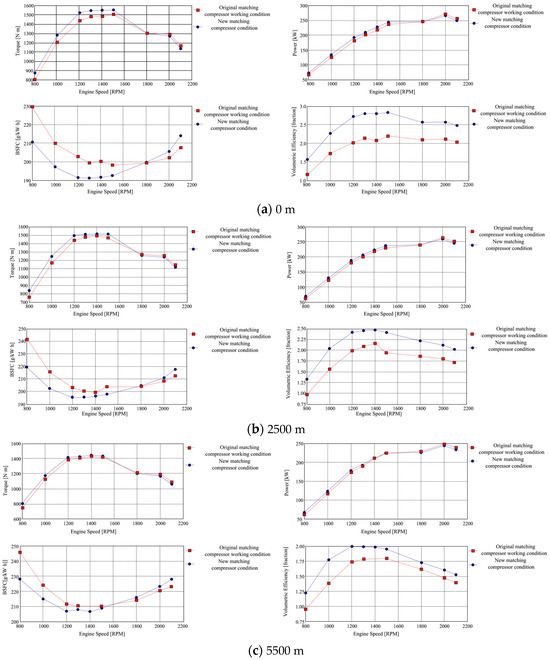 As can be seen from Figure 19, the maximum torque at the point of diesel engine operation at variable altitude and low-speed and high torque is optimized, and the results show that at the altitude of 0 m, 2500 m, and 5500 m, the torque of the optimized compressor diesel engine increases by 5.89%, 3.78%, and 2.18%, and the volumetric efficiency increases by 35.28%, 21.84%, and 14.51%, respectively. Fuel consumption under the maximum torque condition is reduced by 2.89%, 2.80%, and 0.53%, respectively. The rated power under the operating conditions is reduced by 1.63%, 1.05%, and 1.28%, respectively.