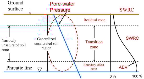 The earth’s surface soils are particularly affected by the atmospheric environment, and changes in the atmospheric environment such as rainfall and evaporation can cause changes in the water content of shallow surface soils [1]. As shown in Figure 1, soils are saturated and the pore pressure is zero at the phreatic line. The soil layer between the phreatic line and the ground surface is unsaturated, and the pore pressure of this unsaturated soil is generally negative. The closer this soil layer is to the ground surface, the drier the soil becomes and the larger the negative pore-pressure value [1,2]. In order to characterize the change in the water content in the soil with depth, the relationship between the water content of the soil and the negative pore pressure was generally used. Later, the negative pore pressure was replaced by suction, and the curve expressing the relationship between the water content (gravimetric water content, volumetric water content, or degree of saturation) and suction was called the soil-water characteristic curve (SWCC), otherwise known as the soil-water retention curve (SWRC) [2]. The SWRC serves as the basis for presenting the hydromechanical properties of soils. The water retention property is closely linked to the soil’s deformation, permeability, and shear strength [3].