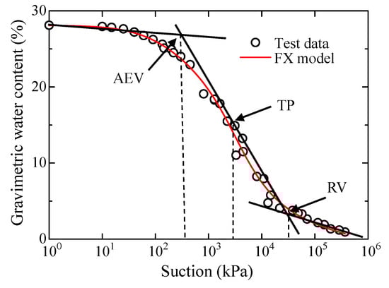 Figure 3 shows the results of fitting the SWRC of Pearl clay (data from [22]) using the FX model, and the fitted parameters of the FX soil-water model obtained from the fitting are detailed in Table 2. It can be seen that the test data can be fitted well using the FX soil-water model. According to the definition of true SWRC parameters by the graphical method, it can be seen from Figure 3 that the AEV of Pearl clay is about 30 kPa, the suction related to the TP is about 200 kPa, and the suction at the RV is about 1600 kPa. Comparing the fitted parameters (Table 2) of the FX model with the measured parameters of the SWRC obtained by the graphical method, it is found that the value of the fitted parameter α is indeed closer to the value of the suction at the turning point, but the value of the fitted parameter Cr is somewhat different from the value of the suction at the RV; however, this difference is not particularly large.
