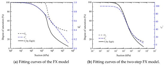 By comparing the results of the fitted data for the above three soils and combining them with data results from the literature, it can be determined that the fitted parameters of the FX model are more in line with the physical meaning when fitting coarse-grained soils (sandy soils); however, for fine-grained soils (clays, especially expansive soils), the fitted parameters are very different from the physical meaning. Therefore, for clay soils, the applicability of the method needs to be further explored when utilizing the FX model. Figure 5a represents the fitting curves (Equations (6)–(8)) of undisturbed complete-intense weathering mudstone using the FX model. These show that Sr1 remains largely unchanged below a suction of 2000 kPa, but at an upper suction of 2000 kPa, the curve begins to decrease, though not significantly. c(ψ) varies considerably during the whole suction range. Theoretically, it is reasonable for Sr1 to play a dominant role, but in the actual fitting process, c(ψ) plays the dominant role. Thus, a partial restriction on the fitting process is required. Based on the above analysis, when using the FX model, in order to let Sr1(ψ) take on the dominant role, it was considered to first fit the test data with the Sr1(ψ) formula and then to refit the test data once again using the FX model with c(ψ), which could determine the parameter Cr, whose fitted data is shown in Figure 5b. It can be seen that Sr1(ψ) is not fixed at 1 within the full suction range, indicating that Sr1(ψ) starts to play a major role in the fitting process, while c(ψ) only plays a role in the high suction range, which can regulate the phenomenon of the fitted curve of (ψ) being too high in the high suction range.