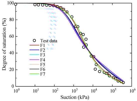 In order to investigate the effect of the initial setting parameters on the fitting curve, some tests were conducted. Before fitting, the fitting parameters α and Cr were pre-set within a range, then Equation (6) was used to fit the test data. The initial limit ranges of α and Cr are shown in Table 4. Figure 6 shows the fitting curves with the different conditions in Table 4. It can be seen that the best fitting effect was achieved without parameter limitations (Test F7). In addition, the fitting curve in Test F1 was also relatively close to the experimental data. However, the fitting curves in Tests F2–F6 were not in good agreement with the test data. The fitting parameters of the FX model of the seven tests are listed in Table 4 (Last column). Through comparison, the fitting parameter α was found to be the upper limit of the initial setting limit, while the parameter Cr was the lower limit of the initial setting limit in every test. Through these experiments, it can be seen that only for larger values of α and smaller values of Cr can better fitting results be obtained. In fact, the parameters α and Cr have already violated their physical meaning in the case of the best fitting (AEV, 350 kPa; suction of the RV, 35,000 kPa). In summary, although the fitting results are relatively good, when simply using this model to fit the curve, the obtained fitting parameters do not conform to physical meanings.