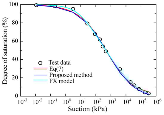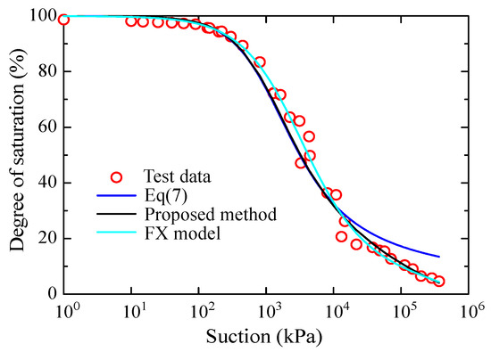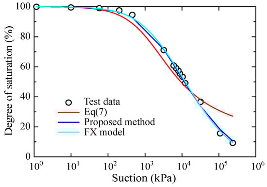Based on the above analysis, when applying the FX model, the process can be divided into two steps: The first step is to first fit the test data using Sr1(ψ) (Equation (7)), which can obtain the parameters α, n, and m. The second step is to use the FX model with C(ψ) (Equation (6)) by substituting the obtained parameters α, n, and m from first step to fit the test data again; then, the last parameter Cr can be obtained. In order to verify the validity of this method, this fitting step was used to fit the test data for the SWRCs of Boom clay [22], undisturbed complete-intense weathering mudstone [21], and silty sand [23].