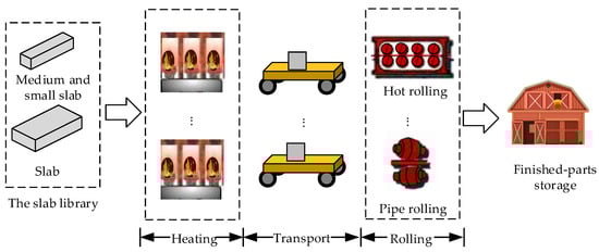 We take the heating–rolling stage in a steel enterprise as an example. When there is a need for processing, the slab is first heated in the heating furnace and then transported by trolley to the rolling stage. Steel rolling includes hot rolling, tube rolling, structural steel rolling, and wire rolling, etc. Semi-finished slabs will be blocked in the heating furnace for insulation when the slab is heated in the heating furnace and all the machines in the rolling stage are in processing mode to prevent material deterioration. The job blocking on machines can lead to energy waste and delay the delivery time. Therefore, a multi-objective scheduling problem for a hybrid flow shop considering transportation time was refined by jointly considering economic and green indicators. Figure 1 depicts the process flowchart for the heating–rolling stage.