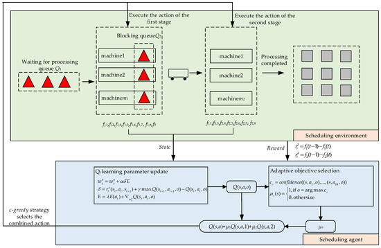 The two-stage BHFSP model with transportation time established in Section 2 is formulated as a multi-objective mixed-integer programming model. HFSP has been proven to be an NP-hard problem [43], and due to the complexity of the problem studied in this paper, it is also NP-hard. Reinforcement learning enables autonomous learning through interaction between agents and the environment. It can adapt to diverse tasks and environments while achieving continuous improvement, giving it an advantage in intelligent decision-making and scheduling. In this section, an adaptive objective selection Q-learning algorithm (AQL) for solving multi-objective scheduling problems is designed. The confidence of the two objective functions is computed using a t-test, allowing for a focus on optimizing the object with the highest confidence.