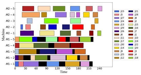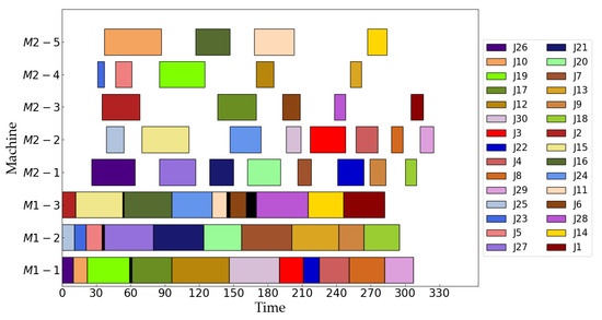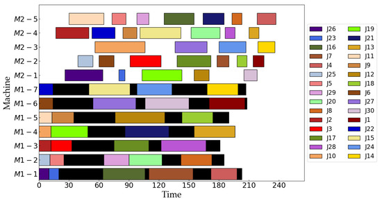 Experiments are conducted with n = 30 in three sets of machine: m1 = 3, m2 = 5; m1 = 5, m2 = 5; and m1 = 7, m2 = 5. Table 5 shows the scheduling solutions obtained by the AQL algorithm for these three sets of experimental scales. Figure 4, Figure 5 and Figure 6 show the corresponding scheduling Gantt charts, where the black areas represent the blocked portions.