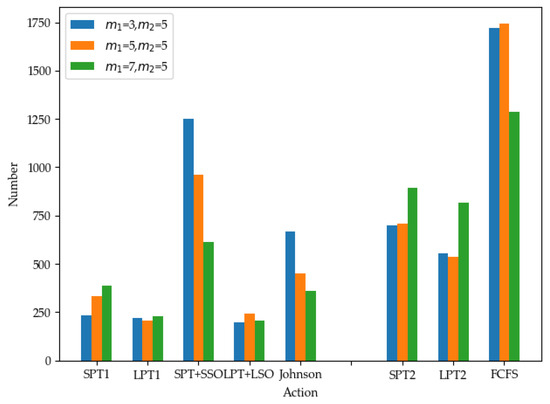 Table 6, Table 7 and Table 8 show the comparative results of the two objective function values obtained by the AQL algorithm and individual scheduling rules at different machine scales, where n is set to 15, 30, 50, and 100, respectively. Figure 7 shows the comparison graph of the frequency of selecting different actions under different machine scales when AQL solves n = 15.