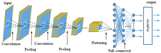 In recent years, deep learning has been successfully applied in the fields of speech image recognition and natural language processing due to its powerful automatic feature extraction capability, providing a new method of fault diagnosis. Proposed by Hinton G. in 2006 [18], deep learning simulates the learning process of the human brain by building a deep neural network, trains network neurons with big data samples, and adaptively learns the feature information hidden in the samples layer by layer, from low to high, to form more abstract high-level features so as to discover the distributed features of samples for recognition. Typical deep learning methods include convolutional neural networks (CNNs), deep belief networks (DBNs), autoencoder networks (AEs), recurrent neural networks (RNNs), etc. Because deep adaptive learning does not require manual feature extraction, it enhances the feature extraction capability and intelligence of the recognition process, eliminates environmental and human influence, avoids the uncertainty and complexity of classical diagnosis methods, and meets the requirements of adaptive fault feature extraction and classification in the context of big data. Therefore, it has been promptly studied in fault diagnosis [19,20,21,22,23,24]. Among these methods, CNN is prominent [25]; for example, a cyclic spectral-coherence-based CNN can achieve high diagnosis accuracy and better generalization ability by applying domain-related techniques to reduce the difficulty of feature learning and obtain high-level feature representations [26]. A common CNN with Gramian noise reduction can improve the performance of denoising and classification for bearing fault diagnosis [27]. By changing the feature weights of various convolution scales and picking out the key features, an adaptive multi-scale fully convolutional network showed its ability to demonstrate feature extraction, noise immunity, and robustness for bearing fault diagnosis [28]. As shown in Figure 1, a CNN consists of an input layer, convolution layers, pooling layers, fully connected layers, and a classifier; its convolution layer and pooling layer are alternately stacked to form a deep network. The functions of each layer are as follows:
