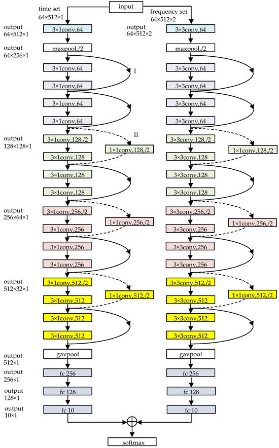 TFRCNN carries out network learning and feature extraction from the two types of data, respectively. Each branch is successively stacked with a simple convolution layer, a maximum pooling layer, eight residual convolution blocks (see blocks I and II in Figure 2), a global pooling layer, and three fully connected layers, among which twenty convolution and fully connected layers are trained. The rectified linear unit (ReLU) activation function is used to update the network parameters in error back-propagation. Its linearity makes the gradient proportional to the ReLU output to avoid gradient disappearance.