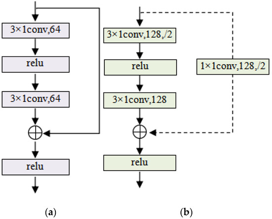 In Figure 3a, both the input shape of the residual block and the output shape of the residual mapping are 64 × 256 × 1, so an identity shortcut was used for a shortcut connection, directly adding the input of the residual block and the output of the residual mapping as the output of the residual block.