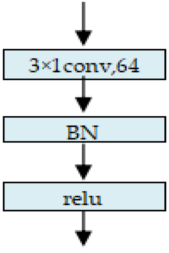 First, 64 time domain samples were fed into the first convolution layer as a batch. Each sample convolved with 64 kernels of 3 × 1, and 64 of 512 × 1 features were extracted. The setting number of features were extracted via convolution to denoise the input signal. The computation and the risk of network overfitting were reduced by sharing the convolution kernel weights.