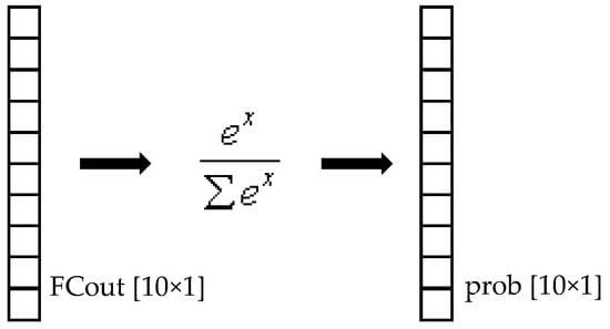 The softmax classifier is shown in Figure 5. It is a normalized exponent function and was used to exponentially transform each neuron in the output vector of the fully connected layer, increase the discrimination from each other, and normalize the neuron value between 0 and 1. The converted vector represents the probability distribution that the test sample belongs to various faults, and the index number of the maximum probability element was picked out as the fault category of the sample. As such, the sample feature extracted using TFRCNN was converted into the probability distribution of various faults and then classified.