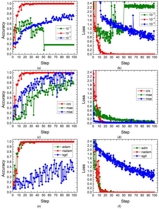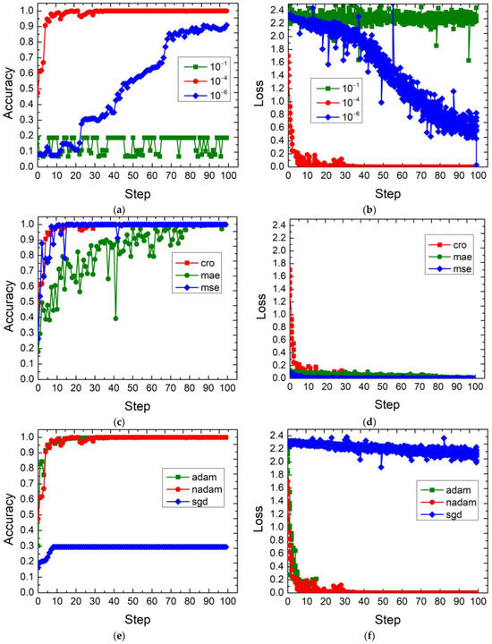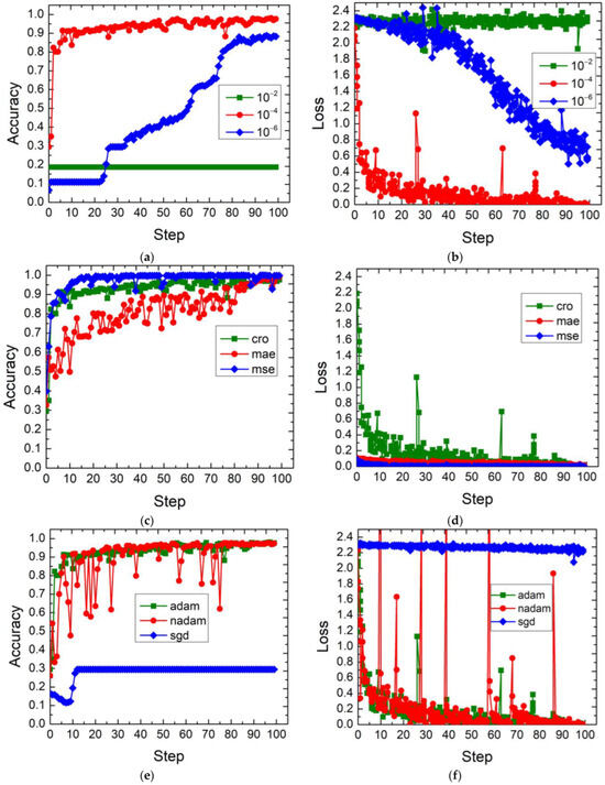TSRCNN training accuracy and loss: (a) training accuracy with the learning rate; (b) training loss with the learning rate (cross entropy, nadam); (c) training accuracy with the loss function; (d) training loss with the loss function (lr = 10−4, nadam); (e) training accuracy with the optimizer; (f) training loss with the optimizer (lr = 10−4, cross entropy).