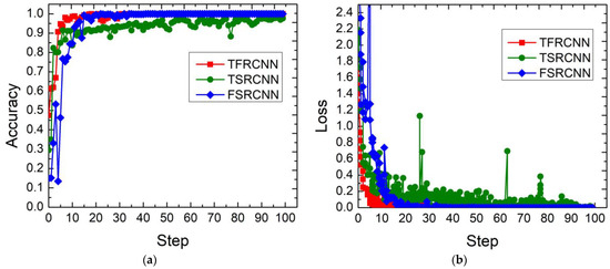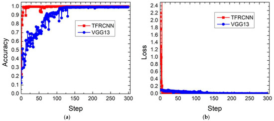 As mentioned above, TFRCNN was optimized with the nadam optimizer, cross-entropy loss function, and an initial learning rate of 10−4. Similarly, VGG13 was optimized using the adam optimizer, mae loss function, and an initial learning rate of 10−4. The optimized training and loss curves for TFRCNN and VGG13 are shown in Figure 17. The convergence rate of TFRCNN was faster than that of VGG13. TFRCNN converged after 20 steps and 80 s, while VGG13 required 150 steps and 180 s.