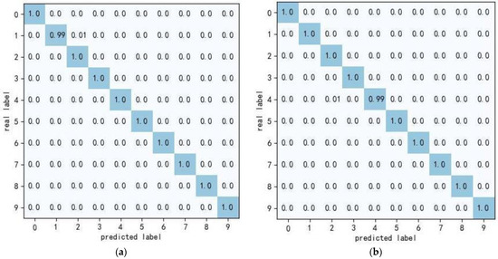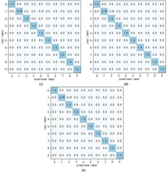 On the whole, the model with the highest prediction capability was TFRCNN, followed by FSRCNN and TSRCNN. The prediction accuracy of TFRCNN stood at 99.52–99.96%, higher than 97.88–99.92% for TSRCNN, and 98.50–99.67% for FSRCNN, as seen in Table 6, along with the high stability measured by the standard deviations. This indicates that TFRCNN was not sensitive to the load changes, which demonstrates that TFRCNN has strong robustness, high prediction accuracy, and wide generalization for all types of loads. Therefore, TFRCNN was better than the other two models. The reason for this is that TFRCNN adopts a double-branch structure with time and frequency domains, which can fully extract complex and diverse bearing fault characteristics, and deeply fuse and efficiently identify bearing faults. TFRCNN has better performance than FSRCNN and TSRCNN, which have a single structure.