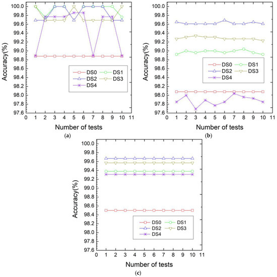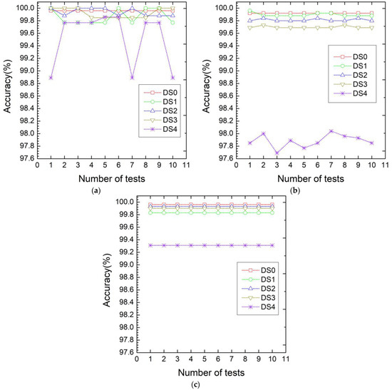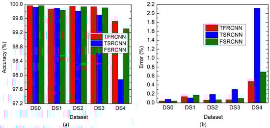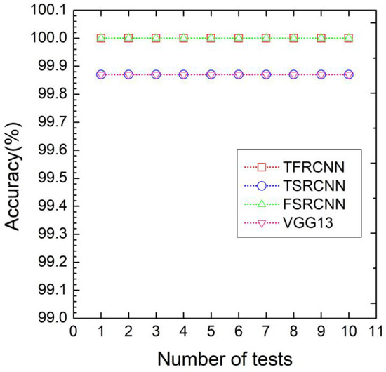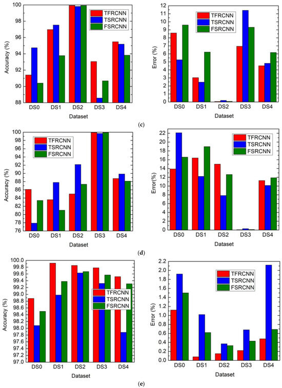 TFRCNN, TSRCNN, and FSRCNN were trained with the training sets, from DS0 to DS4, as shown in Table 3. Then, each model was tested one by one with the test sets under each load. The mean accuracy and corresponding error of the three models are shown in Figure 15a–e. Figure 16 shows the prediction accuracy of the three models trained with DS4 for 10 repeated tests. Accordingly, the mean accuracy and standard deviation are also shown in Table 7.
