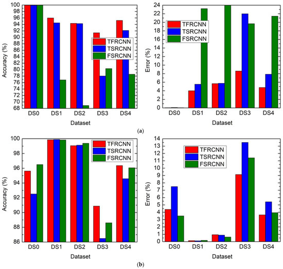 From Figure 15a–d, it can be seen that when the load increased, the prediction capability of the models trained with a single load dataset decreased. For models trained with DS0, DS1, and DS2, the prediction accuracy of TFRCNN remained above 90.87% (see Figure 15b), which was superior to FSRCNN and TSRCNN. The prediction accuracy of the three models trained with DS3 was not high but had a higher fluctuation. Since a big impact and noise under heavy loads aggravate the risk of data contamination and result in specificity enhancement and lack of sparsity of the sample data, the models trained with such data have overfitting and narrow generalization ability, thus reducing the prediction accuracy for the other load cases.