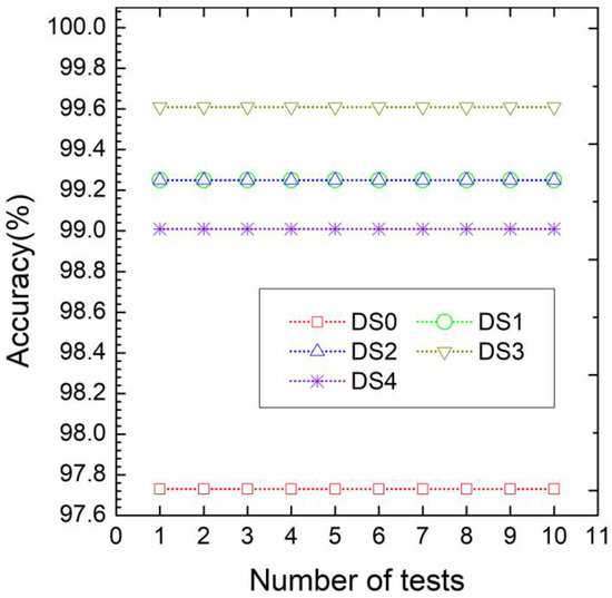 In Table 3, DS0, DS1, DS2, and DS3 respond to the load powers of 0, 735 w, 1470 w, and 2205 w, respectively, and DS4 is a collection of all the loads. The training and test sets for each dataset were composed of 10 types of samples, listed in Table 2.