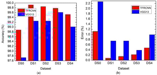 Mean accuracy and error of TFRCNN and VGG13: (a) mean accuracy; (b) mean error.