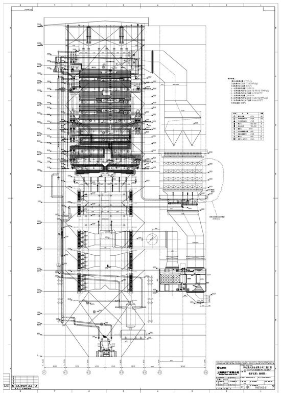 This study focuses on an 1000 MW ultra-supercritical pulverized coal boiler that utilizes a single-furnace tower arrangement. The rear flue gas outlet is equipped with two selective catalytic reduction (SCR) reaction devices, each of which is accompanied by a rotary air preheater positioned below it. Figure 1 provides a plan view, while Figure 2 offers a side view of the comprehensive layout of the boiler. The overall dimensions of the boiler are as follows: furnace width of 20,760 mm, furnace depth of 20,760 mm, lower header elevation of the water-cooled wall at 7500 mm, furnace top pipe center elevation at 121,500 mm, and top elevation of the large plate beam at 131,400 mm. During the startup of the unit, when the boiler load falls below 30% of the boiler maximum continuous rating (BMCR), the medium from the outlet of the evaporator heating surface gathers in a collector box after passing through the water-cooled wall outlet. Subsequently, it is conveyed to the steam–water separator through four pipes for separation into steam and water. The upper part of the boiler features a sequential arrangement of the low-temperature superheater, the low-temperature section of the high-temperature reheat, the high-temperature superheater, the high-temperature section of the high-temperature reheat, the low-temperature reheat, and the economizer, all aligned along the flue gas flow direction. The heating surfaces in the upper part of the boiler are horizontally arranged, and the through-wall structure takes the form of a fully sealed metal enclosure.