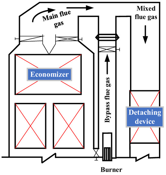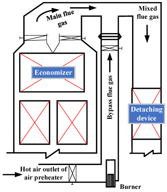 The data in Figure 3 illustrate the SCR inlet flue gas temperature and NOx emission concentration curves during the startup phase of a 1000 MW coal-fired plant. It is crucial to maintain the system’s total energy constant throughout the process, ensuring equilibrium between coal-derived input energy and outputs like heat, electricity, and losses (e.g., friction and radiation). The heat transfer mechanism involves conduction, convection, and radiation from coal to the boiler tubes, steam, turbine, and generator. Pulverized coal injection significantly elevates NOx emissions at the furnace outlet, surpassing standard limits swiftly. Nonetheless, the SCR inlet flue gas temperature (<300 °C) remains below the optimal operational range of the denitrification system (from 300 °C to 420 °C). This significant divergence between the SCR inlet flue gas temperature and the denitrification system’s working temperature poses a challenge to effective DeNOx system functioning, necessitating a flue gas temperature increase. This investigation explores three potential schemes to elevate the SCR inlet flue gas temperature in a 1000 MW coal-fired power plant.