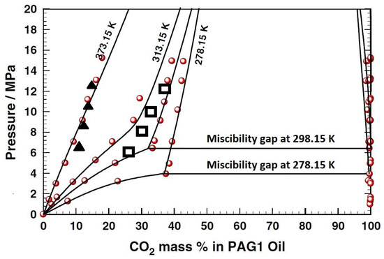 Solubility of CO2 in PAG oil [18] (▲ and ☐ predicted with Equation (33), respectively, for 373.15 K and 313.15 K).
